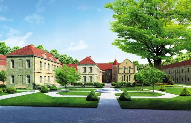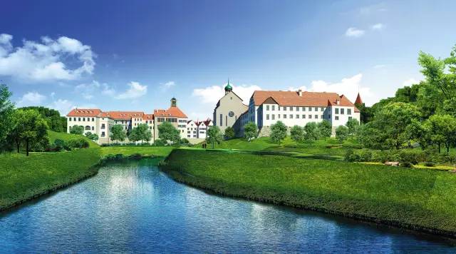 根据用地起伏、靠近松山湖水域的地理位置特点,结合瑞士极具历史性的古城和修道院建筑,通过棕红色瓦斜坡屋顶和绿色砂岩外墙等特征,打造面向湖畔的斜面风景。
