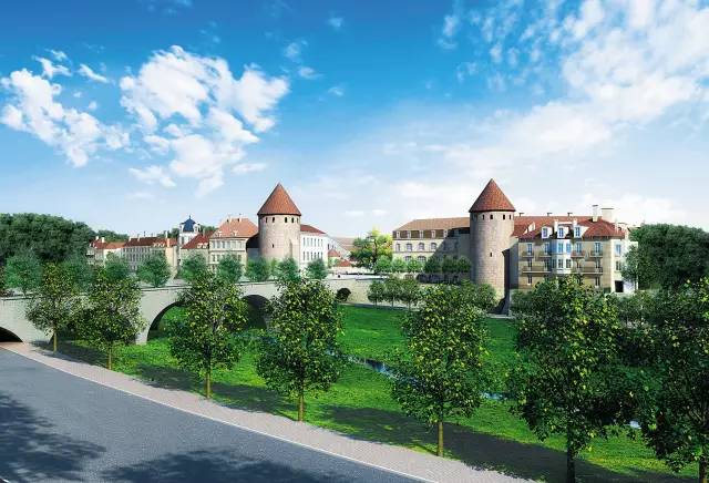 将2至3层建筑布局在基地的低洼部分,4至5层的建筑布置在基地的高地部分,形成“丰富的街路空间”,再现一个童话般的小镇。参考捷克小镇克伦诺夫的城堡、教堂、修道院等大型建筑的建筑特色,整合蜿蜒曲折、壮丽秀美的河流,构成尺度宜人的步行空间。