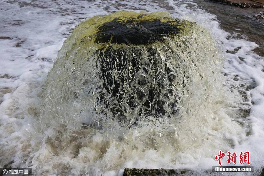山东青岛正值天文落大潮,裸露在灵山湾海滩上的市政排水井暴涌状如“蘑菇泉”,场面甚是壮观。