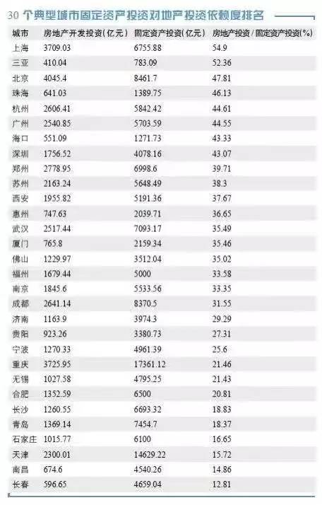 而从记者独家统计的30个典型城市地产投资依赖度排行榜来看,三亚、海口、郑州、西安、珠海、杭州、贵阳等城市的经济增长对房地产投资的依赖程度更为严重,有些城市已经高得离谱。
