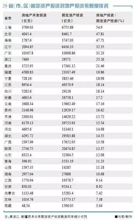 按照25%的合理标准,29个省份(黑龙江、新疆未公布固定资产投资数据)中,2016年度房地产投资额占固定资产投资比重超过这一数值的省市有6个,分别是上海(54.9%)、北京(47.81%)、海南(47.71%)、辽宁(32.55%)、广东(31.23%)、浙江(25.26%)。这些地方的楼市泡沫压力已经显现。