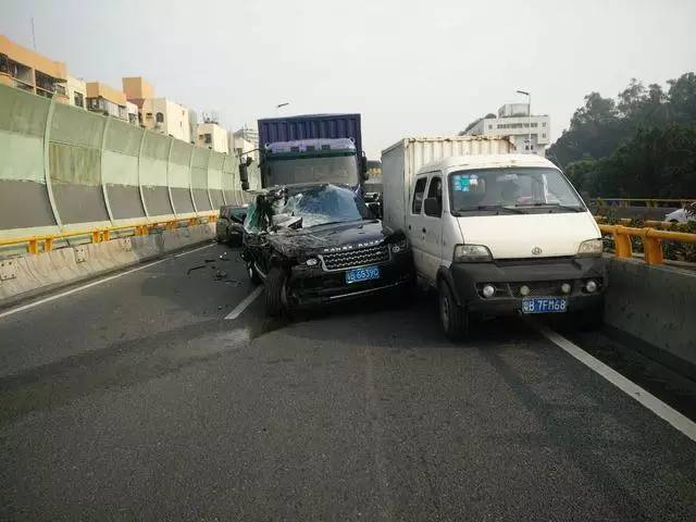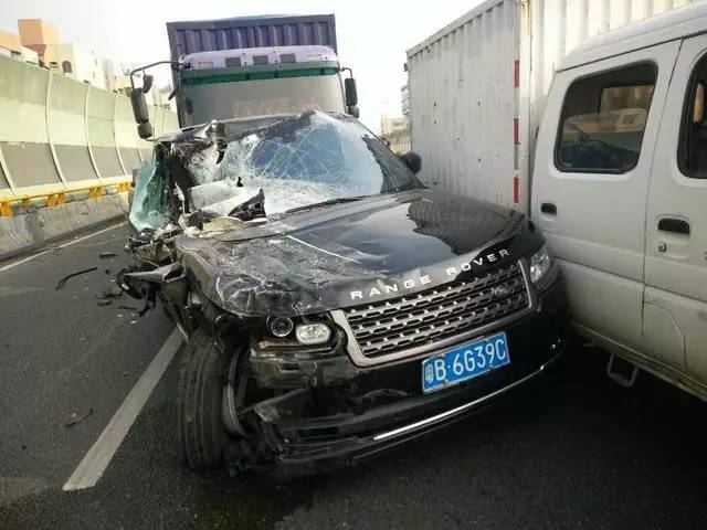 事故现场,六辆车连环相撞,车辆损毁严重,现场的路虎、别克小车都被撞得面目全非。