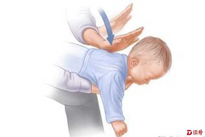 先将婴儿的身体伏在急救者的前臂上,头部朝下,急救者用手支撑婴儿的头部及颈部,用另一只手的掌根拍击婴儿背部和肩胛骨之间的区域,连续5次,大约1秒1次。