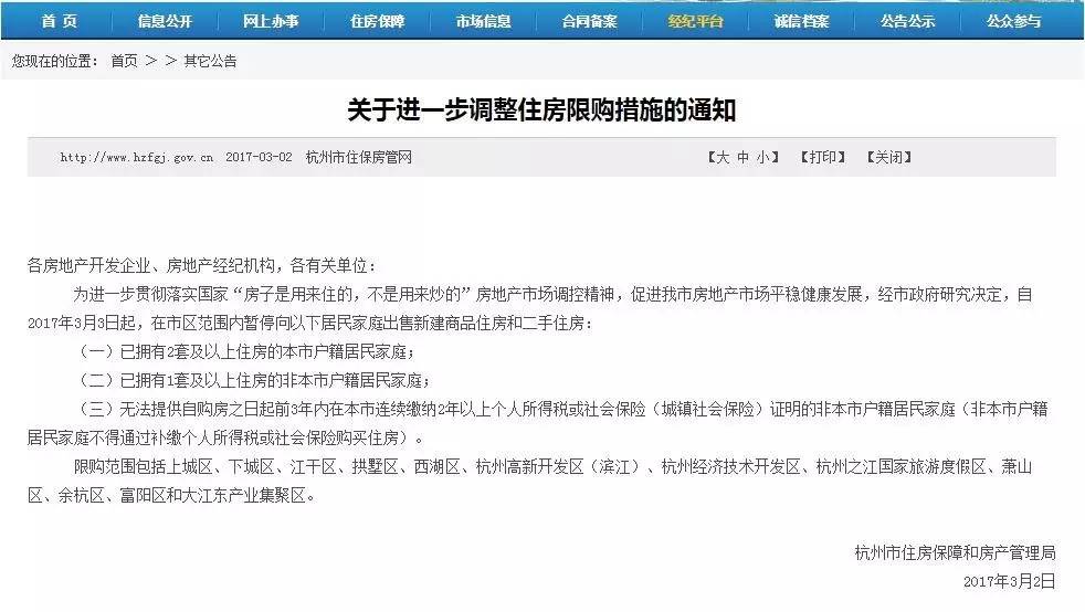 3月2日下午,杭州市住房保障和房产管理局发布消息称,为进一步贯彻落实国家“房子是用来住的,不是用来炒的”房地产市场调控精神,促进杭州市房地产市场平稳健康发展,经市政府研究决定,自2017年3月3日起,在市区范围内暂停向以下居民家庭出售新建商品住房和二手住房: