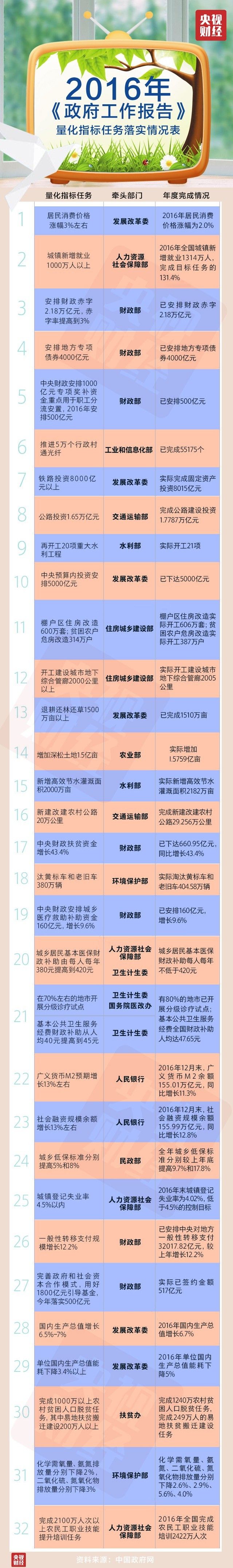 国务院日前对外公布了2016年《政府工作报告》量化指标任务的落实情况,三十多项硬指标有的达标完成,有的超额完成,描绘出过去一年我国经济社会发展的“开局答卷”。一起来看看过去一年间,政府给出的“成绩单”。