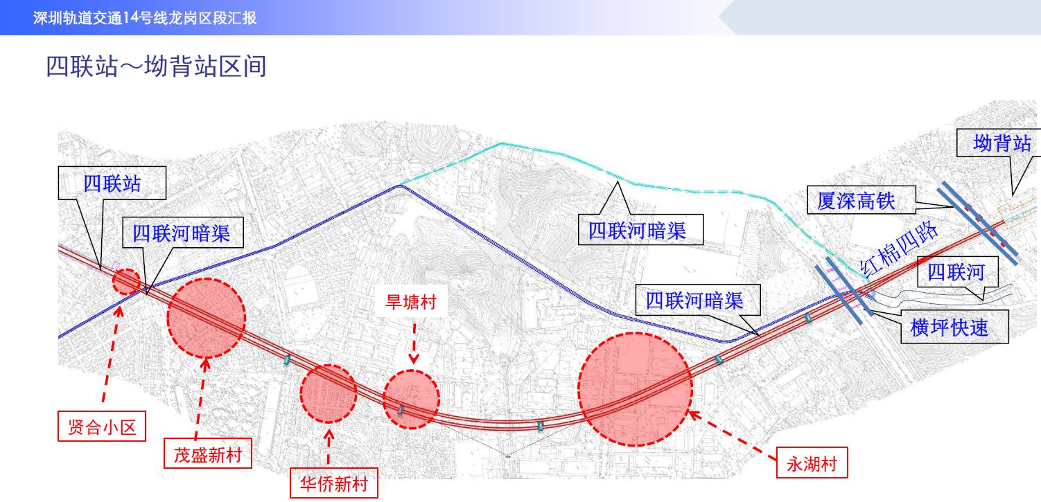 四联站~坳背站区间,区间自四联站出发后,往东北方向敷设,先后下穿贤合小区、茂盛新村、华侨新村、旱塘村、永湖村大面积民房及工业厂房随后拐入红棉三路,沿红棉三路-红棉四路下方敷设到达坳背站。区间下穿房屋群、四联河防洪工程、四联河、厦深铁路等风险点。 区间下穿贤合小区、茂盛新村、华侨新村、旱塘村、永湖村大面积民房及工业厂房,共涉及面积约89530平米。