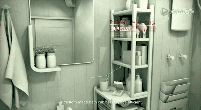 一层洗手间、淋浴房、橱柜、餐厅、客厅、客房等空间井然有序,合理的规划、巧妙的榻榻米设计、隐藏式功能模块,让这里轻松容纳近百双鞋、全尺寸冰箱和洗衣机,还有可容纳最多10人休息的“超级床”。