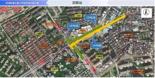 四联站为14、18、19号线的换乘站,14号四联站东西向设于红棉道与横岗一号路交叉路口东北侧。