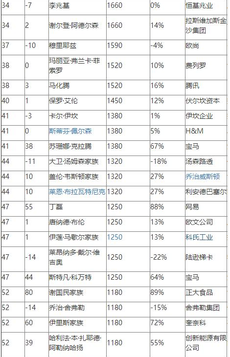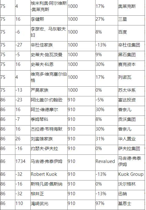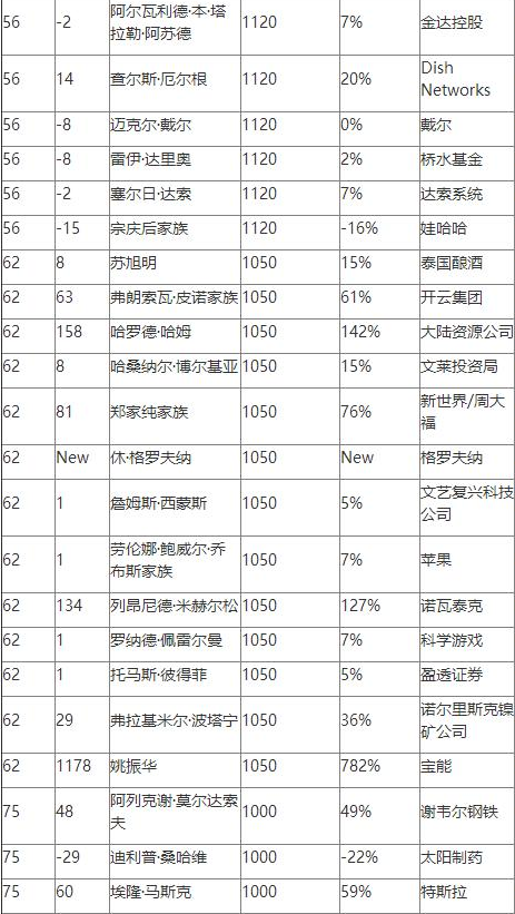 据统计,来自68个国家、1811家企业的2257位十亿美金富豪上榜,上榜人数达历史最高。他们的总财富为55.9万亿元,上涨16%,相当于全球GDP的10.7%分地区看,大中华地区以609位十亿美金富豪人数第二年领先于552位的美国,分别比去年增加41位和17位。