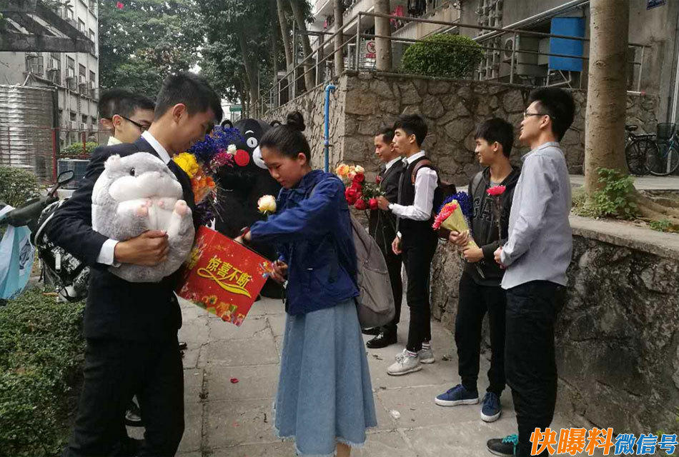 昨日,华南师范大学也刮起了一阵“女神”风暴,广州的曾同学向“快曝料”微信号报料,称华师旅管专业大一男生出大招,早晨7点不到两排男生站在女生宿舍楼下,不仅送“KFC汉堡、粥”,“熊本熊”还送鲜花、公仔、拥抱和红包,他说:“鲜花是去花卉市场批发的,玫瑰大概买了四十多束,因为菊花比较便宜,也买了不少。”