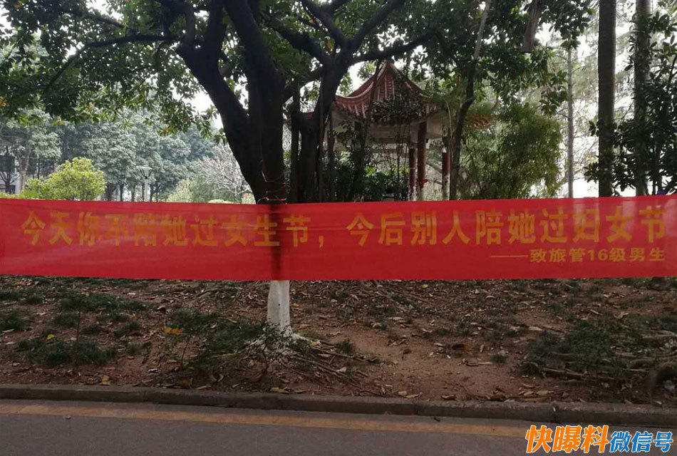 男生们前一晚还在校园里挂了两条标语,“昨日你不陪她过女生节,今后别人陪她过妇女节”“少吃鸡腿多喝热水,旅管女生越来越美”。编辑想问,这是嫌女生抢了男生的鸡腿吗?