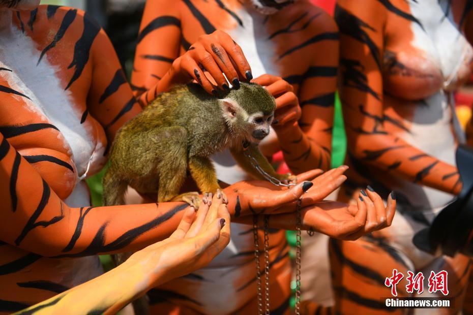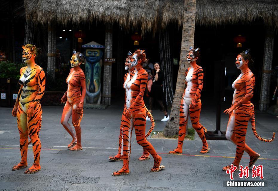 3月8日,“三八”妇女节,三亚宋城彩色动物园举行人体彩绘活动,多名模特身体被彩绘成老虎的模样在动物园内进行表演,她们用行为艺术的方式呼吁忙碌的女性们要懂得释放压力、还原自我。