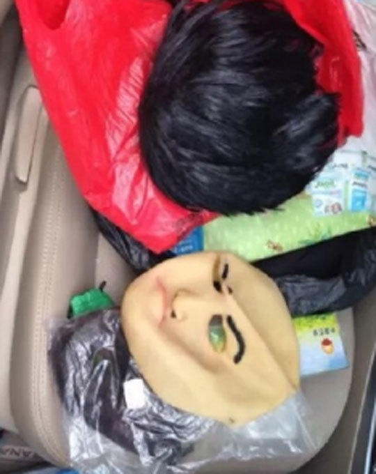 交警通过联系车主获悉,该车于3月11日7时30分在东莞凤岗镇发现被盗,已报案。目前涉案车辆已移交东莞警方调查处理。图为警方搜出的假发和面具。