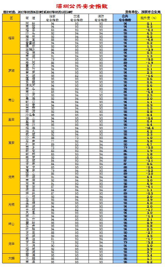 深圳新闻网讯 深圳市公安局围绕市委市政府“城市管理治理年”工作部署要求,借鉴国内其他城市的成功做法,于2016年4月5日开始,每周通过《深圳特区报》、《深圳新闻网》、市公安局门户网站、公安微信、微博,向社会发布一次深圳公共安全指数,保障市民群众知情权、监督权,引导社会各界广泛参与 “平安深圳”建设。