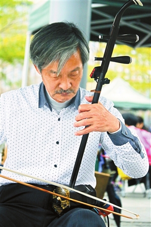 61岁的骆宏俊演奏二胡时非常投入,一曲终了,才略微抬头瞥一眼观众。他说他喜欢“满世界拉二胡”。