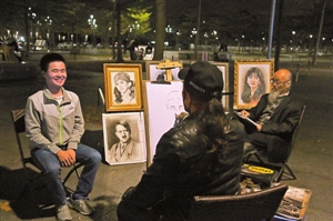 夜幕降临,华灯初上。市民中心广场变成了街头艺人们的主场。71岁的赵老(右)画速写,搭档老金画肖像。