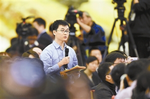 深圳特区报、读特新闻客户端记者甘霖向李克强总理提问。 深圳特区报特派记者 何龙 摄
