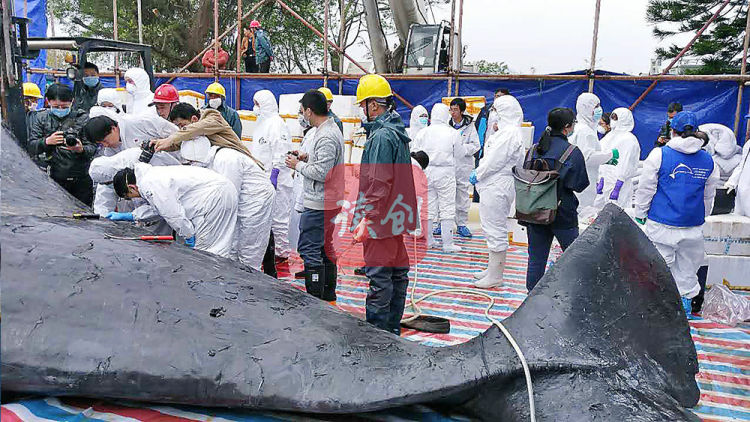 下午16:46分,刚刚惠州方面召开新闻发布会,公布了抹香鲸飘到惠州海域后的处置情况。解剖现场正在布置灯光,专家准备挑灯夜战,继续工作。