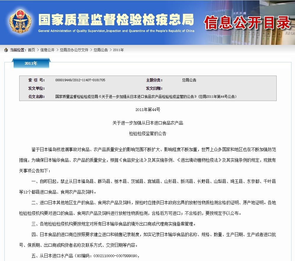 早在2011年4月8日,国家质检总局就发布公告,扩大禁止从日本进口食品、农产品的品种和产地范围,进一步加强检验检疫监管。