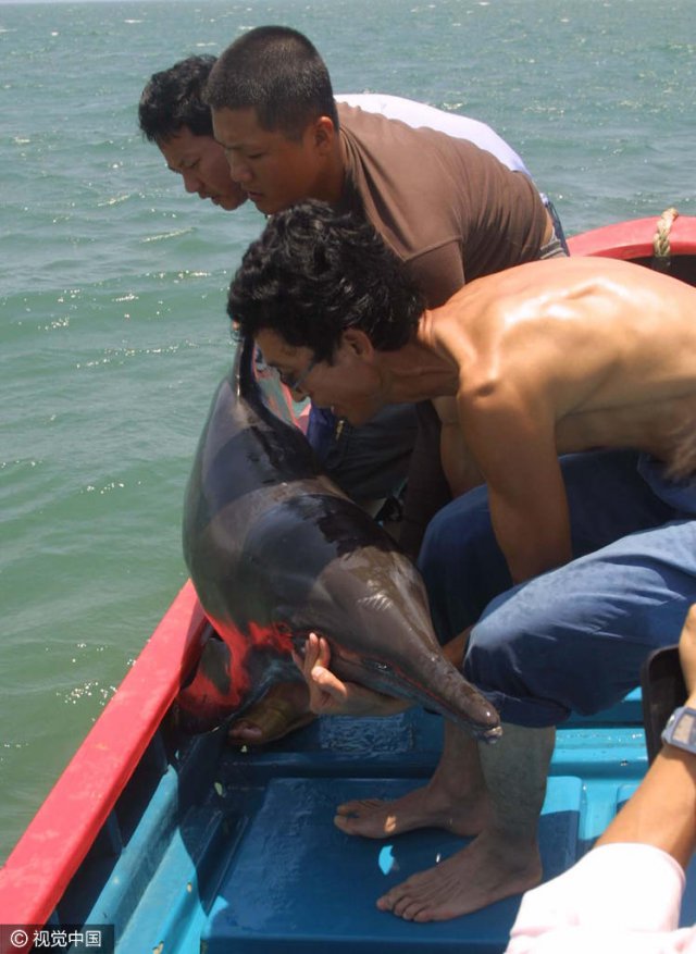 2005 年 5 月 13 日,海南文昌市清澜镇南海村,一条 2 米长的未成年海豚闯入渔网。海豚苦苦挣扎两个小时,被渔民发现时已经奄奄一息。渔民马上展开施救,于当晚 9 时抢救成功,送回了大海。