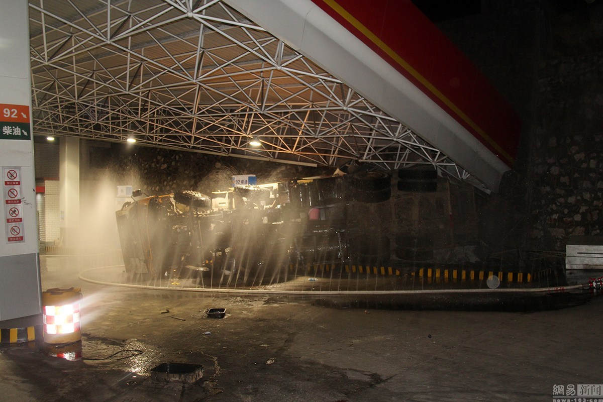 新闻提要 四川攀枝花西区新庄加油站内,一辆满载矿石的卡车准备进站加油,不料卡车突然失控直接撞向了加油站右后方站棚柱,导致加油站棚柱被撞断,卡车侧翻,油箱漏油,加油站的棚顶发生倾斜坍塌,压在卡车上。
