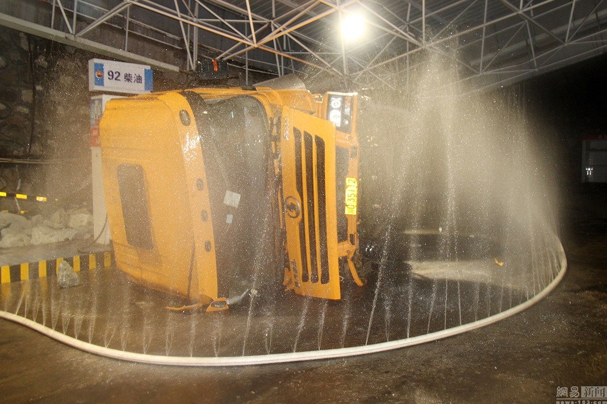 四川攀枝花西区新庄加油站内,一辆满载矿石的卡车准备进站加油,不料卡车突然失控直接撞向了加油站右后方站棚柱,导致加油站棚柱被撞断,卡车侧翻,油箱漏油,加油站的棚顶发生倾斜坍塌,压在卡车上。