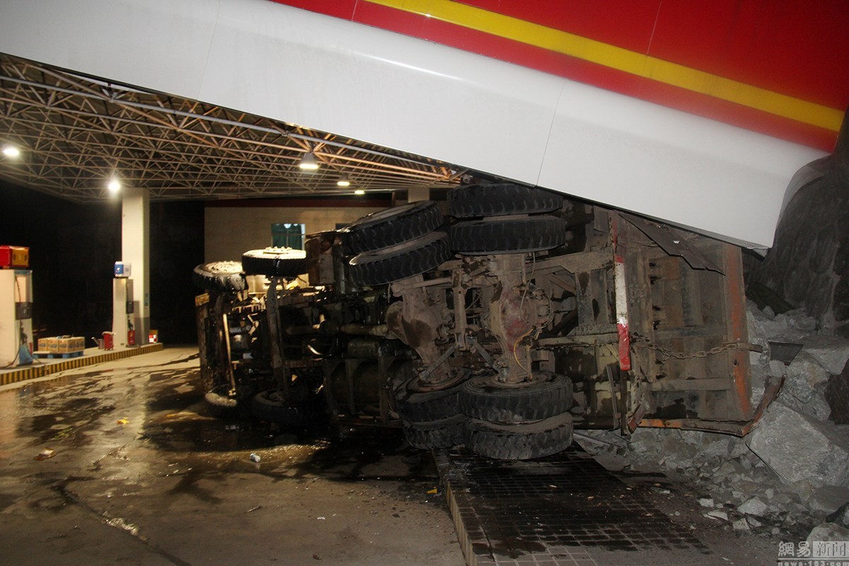 四川攀枝花西区新庄加油站内,一辆满载矿石的卡车准备进站加油,不料卡车突然失控直接撞向了加油站右后方站棚柱,导致加油站棚柱被撞断,卡车侧翻,油箱漏油,加油站的棚顶发生倾斜坍塌,压在卡车上。