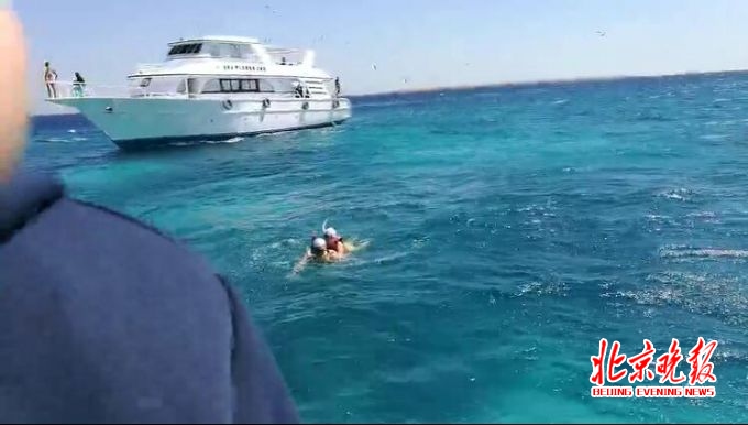 女游客在水中大声呼救。一位男子闻讯后迅速游去营救。女士趴到了男子后背上。男子背着女士游向游艇。