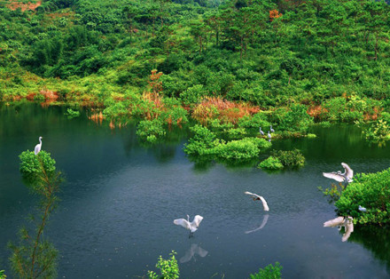 清林径景区山多而不高,最高的红花岭也不过280多米。因为山地起伏,所以很多小山头浸于水中,形成了众多水中小岛。遥遥看去,水中有岛,岛上有林,林间有亭,让清林径景区多了几分神秘与变化。