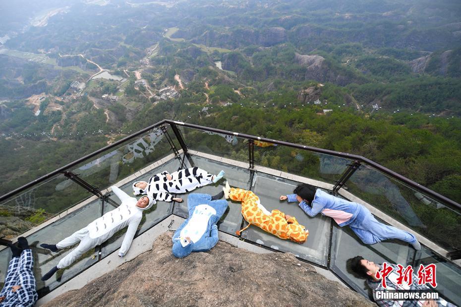 3月21日,正值世界睡眠日,游人身着卡通睡衣躺在湖南平江石牛寨的悬崖玻璃栈道上,摆出各种睡姿享受睡眠,以此行为艺术呼吁关注睡眠健康。