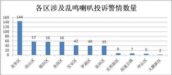 2016年以来,深圳交警通过电话、微博、微信、“民意云”平台等渠道,共收集到群众反映涉及“乱鸣喇叭”的投诉、警情达456宗。从具体各区分布情况看,其中龙华区最多、达144宗,大鹏新区最少,为2宗。