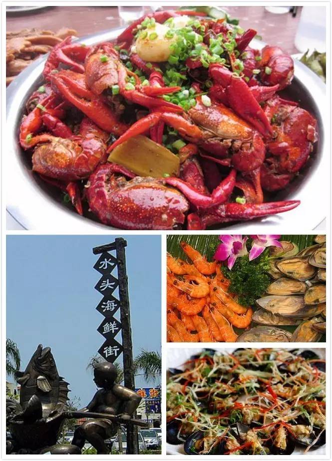 位于东部大鹏镇和南澳镇之间,水头海鲜食街起源于1995年,当时北面有30多家海鲜食店,南面是销售海鲜的鱼档。鱼档专门卖各种刚刚捕捞上来的新鲜海鲜,鱼、虾、蟹、贝类、海胆等等应有尽有,价格比市内便宜近一倍,非常实惠。