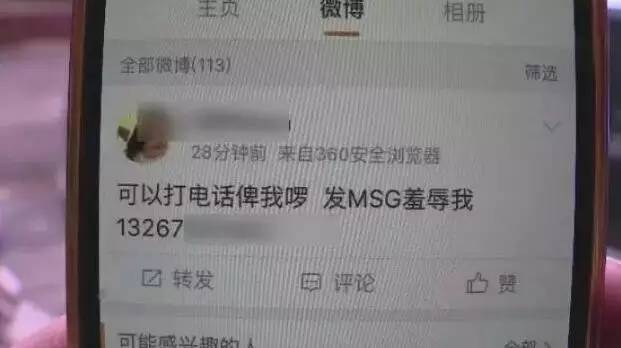 徐小姐说,这个发微博的人是他的前男友。说到他,还得从十年前说起,时年正在念高一的徐小姐,与同年级的一名男生邓某早恋了。徐小姐猜测,邓某采用这样的方式对待她,可能是被拒绝后的一种报复。现在,徐小姐的精神状态并不稳定,她的家人朋友也都十分担心她的安全。目前徐小姐已经向公安机关报案,辖区警方已经介入调查。