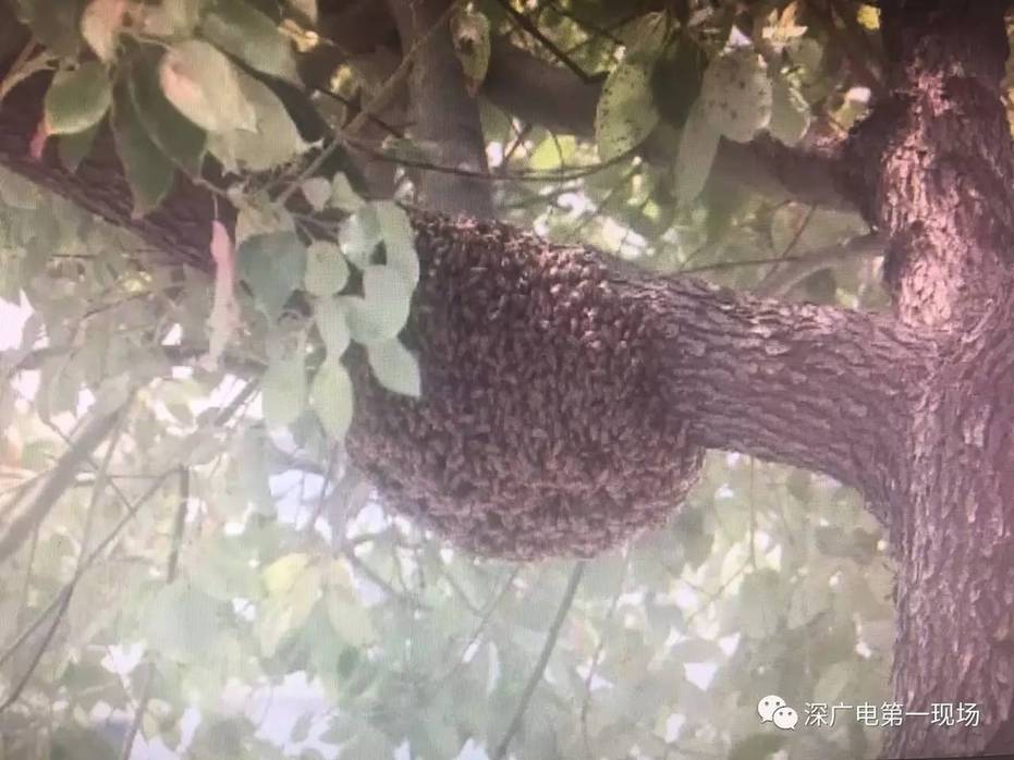 从陈先生拍的视频可以看到,在这棵树旁密密麻麻的飞了好多只蜂,记者在侨城东路地铁人才安居大厦旁找到了这颗树。树上确实有蜂窝,而且个头不小,让过往市民有些忐忑。