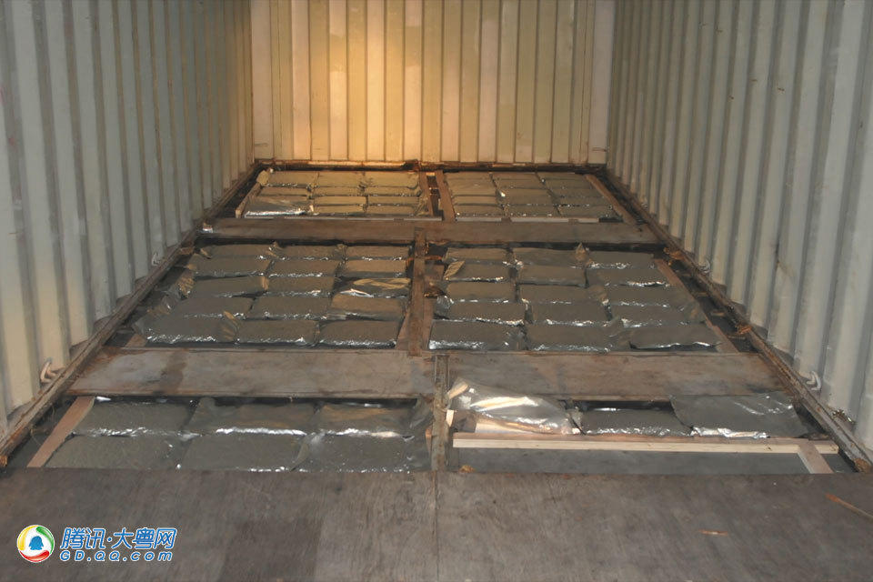 图为警方搜出的毒品,被压缩成一块块铺在货柜的地板上。