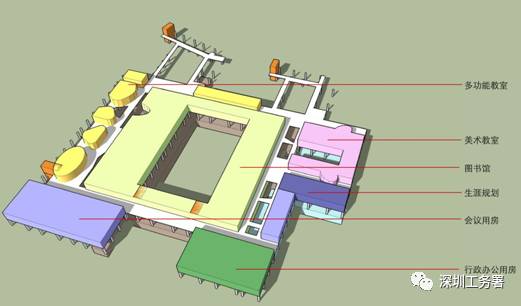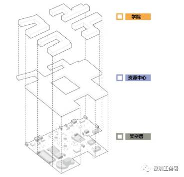 四大学院楼与资源中心竖向叠加整合;首层架空;屋顶有花园。