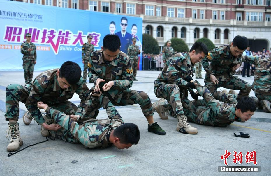 四川西南航空职业学院举办职业技能大比武,来自该学院空乘、空保专业的400余学生就乘务员餐车速配、擒拿格斗、水陆撤离等展开了现场比拼,比武旨在提升学生们的专业技能水平,以赛促训。