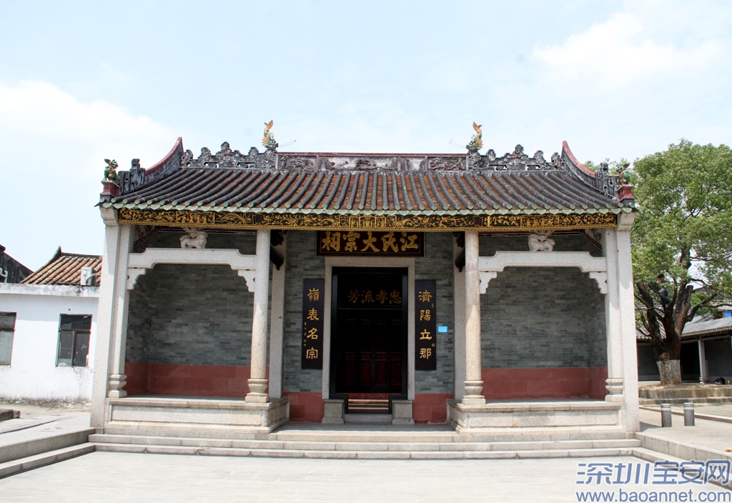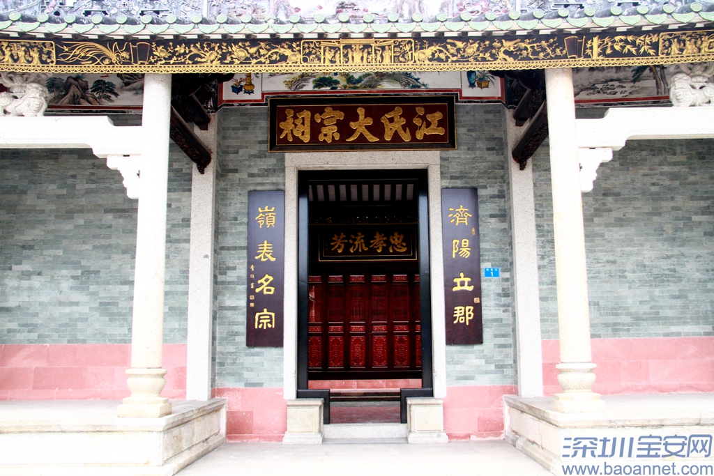 隐匿在步涌旧村落里江氏大宗祠,周边环境十分幽静,相比环绕四面的混泥土居民楼,宗祠的建筑风格显得十分古朴清新。记者从原住村民了解到,这一古建筑能够保留至今实为不易,七十年代前栋曾遭拆毁,直到2003年才做较为完整的重修,前栋按原貌恢复,中后栋作重修时保存原建筑材料和建筑,现为沙井镇人民政府和宝安区人民政府文物保护单位。