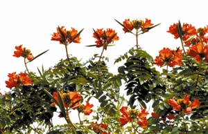 火焰木 (学名:Spathodea campanulata)紫葳科火焰木属,又名火焰木、苞萼木,原产于非洲,因为树顶有鲜艳夺目、犹如火焰的花朵而得名。花冠外橙红色而内黄色,像郁金香,花比凤凰木更大而鲜艳,树叶亦较浓密和深绿。