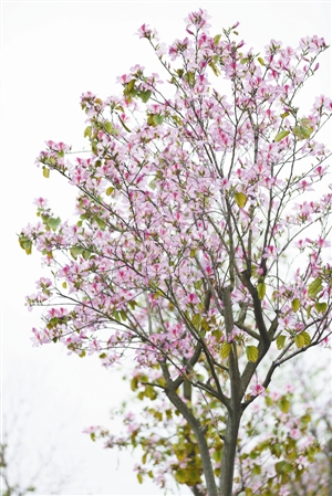 宫粉洋紫荆 (学名:Bauhinia variegata )豆科羊蹄甲属,别名:粉花羊蹄甲、红紫荆、红花紫荆、弯叶树等。宫粉紫荆原产于中国南部,印度、中南半岛亦有分布。先花后叶,花期长,有华南樱花之美誉。