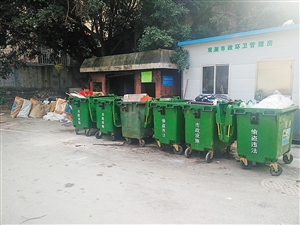 民治隔圳新村81号,垃圾桶无盖、转运桶未规范摆放。