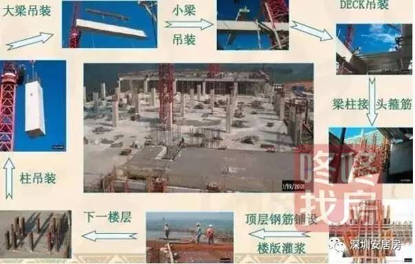 采用大型吊装机械将各种构件现场装配,就位后再将构件之间的节点现浇连接成整体,形成完整的主体建筑结构。