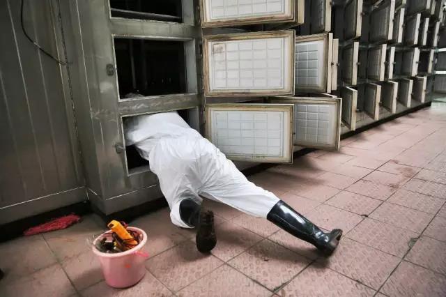 遗体接运部正面对防腐间。这里24小时总有2个人待命。每当这座城市有生命逝去,经过电波传递,一辆接运车从殡仪馆便缓缓驶出……在防腐部的上方,阳光正透过顶部玻璃照在包裹着逝者的蓝色密封袋上。从零下8℃恢复至常温,解冻是寂静冰冷的。守在这里的人每天耐心地分类、记录信息、清理设备……阳光渐斜,光线在冰柜一角蓦然折出一道暖色的光。遗体解冻至适合温度后,工作人员开始为其清洁、着装、入棺,入殓师们走进化妆间为逝者用酒精拭面,准备化妆。最后,棺木被推向烈火之中,经过40~60分钟焚烧,一切化为灰烬。骨块被收集、冷却和碾压,然后装入骨灰罐中,送至家属手上。一个生命就此走向终点。