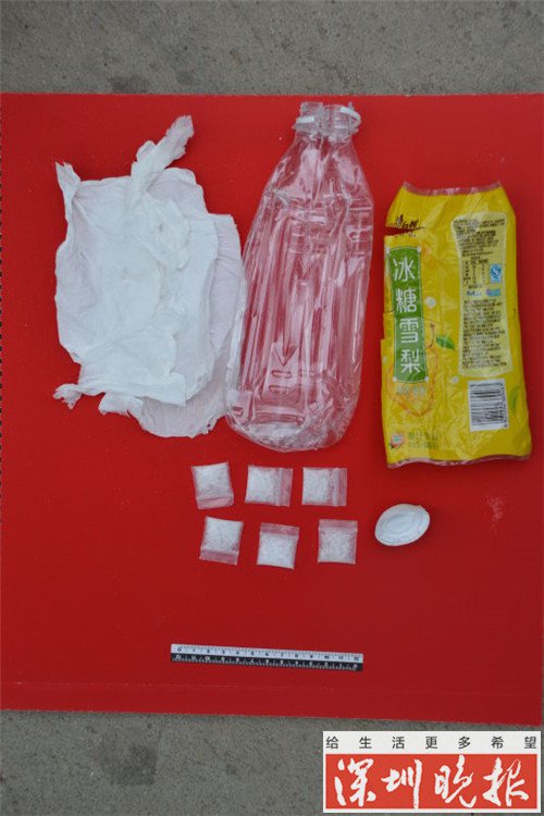 对此,民警上报请求缉毒犬支援。最后经过缉毒犬扩大搜索范围,在距离嫌疑人供述地址约 80 米的马路上发现已被车压扁的矿泉水瓶,内有 " 冰毒 "6 小包约 5 克。