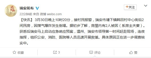 新闻提要 事故发生在韩田中心街153号附近,现场拉起了警戒线,消防、民警已经到场施救。瑞安市新闻办官微发布的通告称,有2人被困,具体原因正在进一步调查核实中。