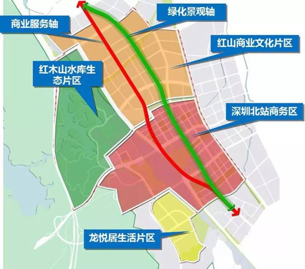 曾经偏隅龙华,如今潇洒转身。未来,它还会迸发出怎样的后劲呢?根据规划,深圳北站商务中心区将以两轴四片空间结构为核心,打造山、城、水相融的城市中心。两轴为商业服务轴、绿谷景观轴;四片则为深圳北站商务片区、红山商业文化片区、龙悦居生活片区、红木山水库生态片区。其规划总占地面积610万平、总建设规模950万平、居住人口规模约11万人、就业人口25万。