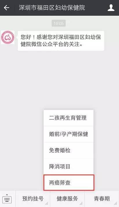 3. 关注福田妇幼保健院微信公众号,点击“两癌筛查”门诊进行预约