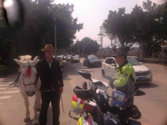 铁骑马上引导马匹和人员靠边,该骑手表示由于附近塞车,所以要骑马上班。