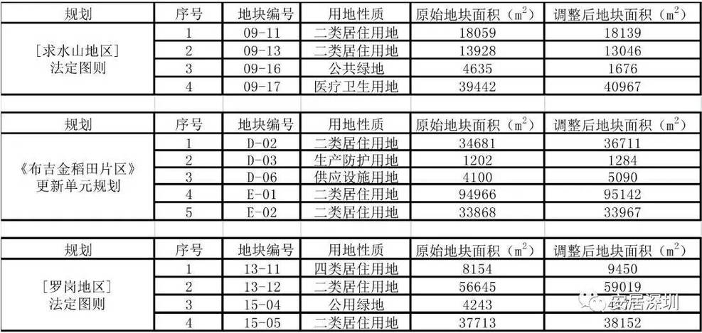 (三)《布吉金稻田片区更新单元规划》:涉及D-02二类居住用地、D-03四类居住用地、D-06供应设施用地、E-01二类居住用地、E-02二类居住用地的面积调整(具体数据详见附图表)。