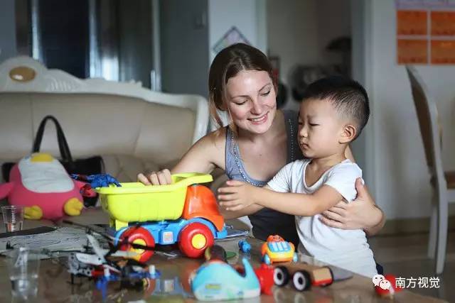 小宝从幼儿园放学回来后,Galina就陪他玩游戏,引导孩子说英文。